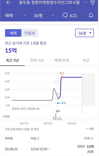 최근 거래된 매매가격이 15억입니다. (계약일 23.08.22)