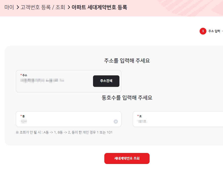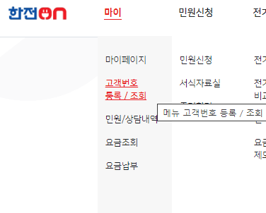 세대별로 등록된 고객번호를 먼저 등록해주어야 합니다. (마이> 고객번호등록/조회)