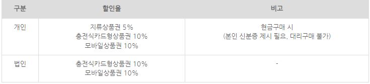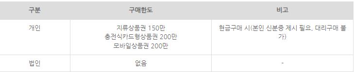 ✅ 구매 한도: 개인은 지류상품권 150만 원, 충전식 카드형 상품권 200만 원, 모바일 상품권 200만 원까지 구매할 수 있습니다.